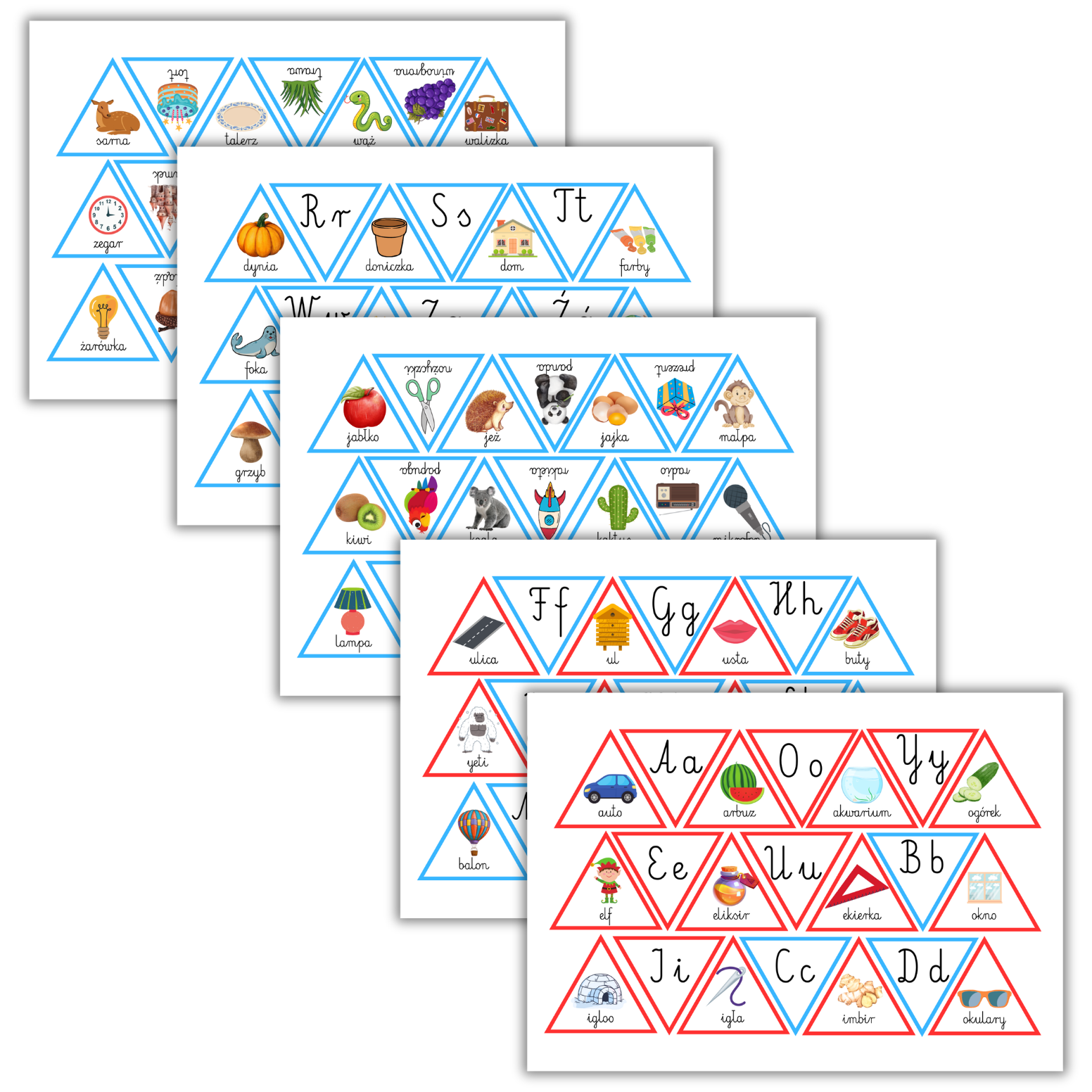 Zestaw obejmuje 25 liter (a, b, c, d, e, f, g, h, i, j, k, l, m, n, o, p, r, s, t, u, w, y, z, ź, ż). Do każdej litery przypisane są 3 obrazki zaczynające się na daną głoskę, które po ułożeniu tworzą kształt piramidy.