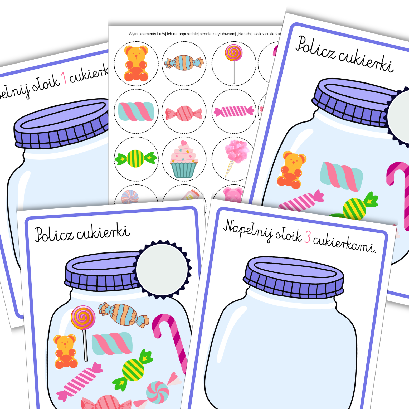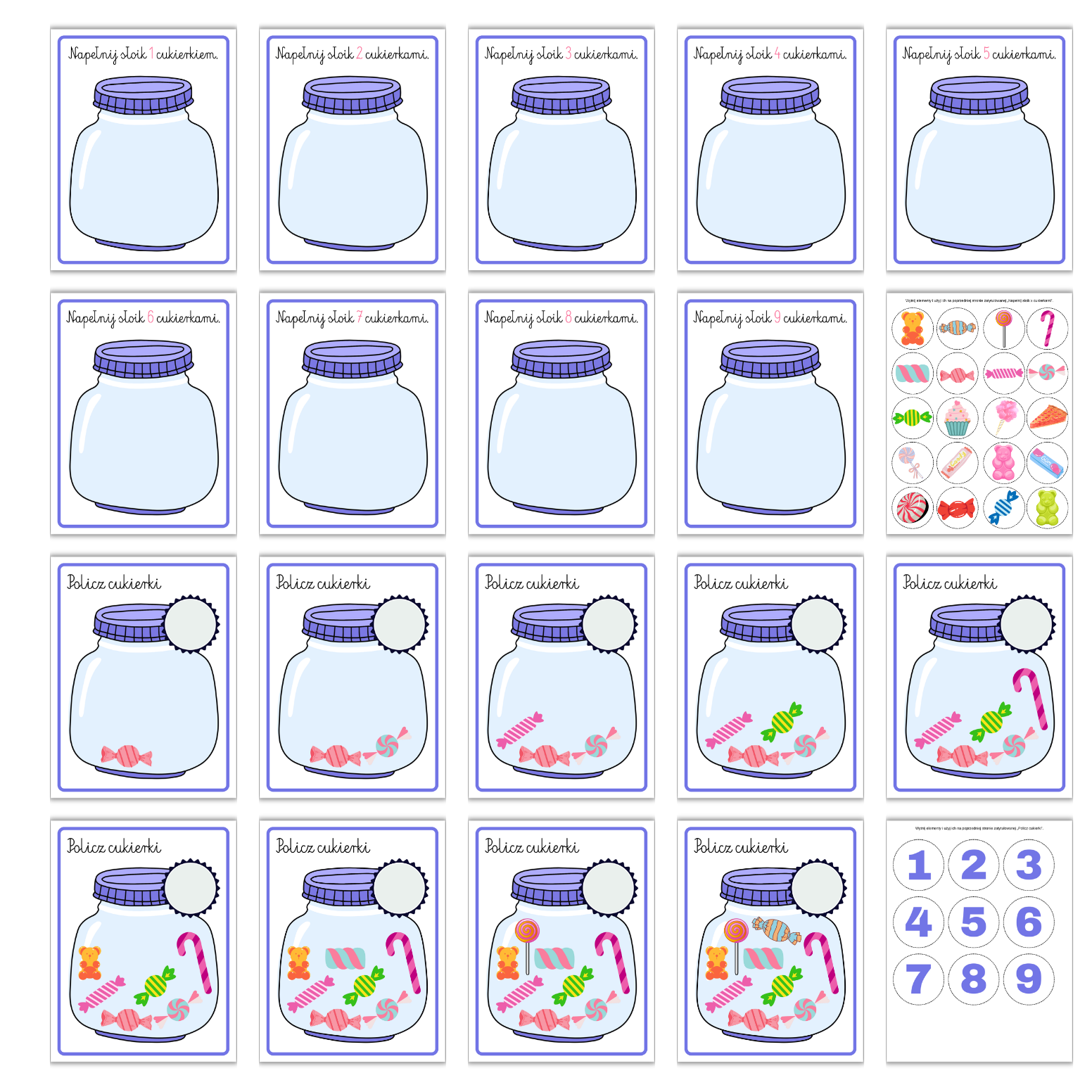 – Zadania „Policz cukierki”: Karty do przeliczania gotowych słodkości w słoikach.