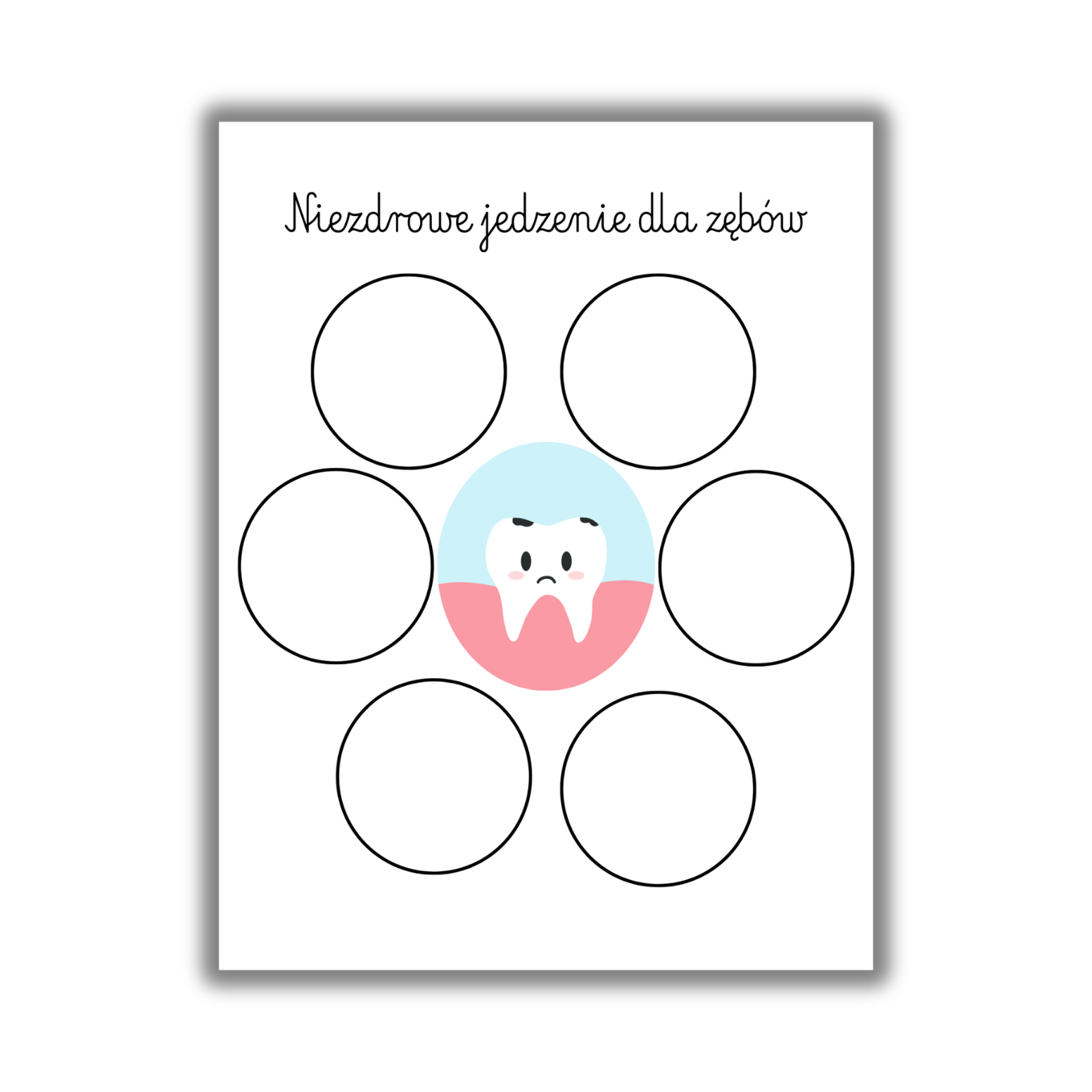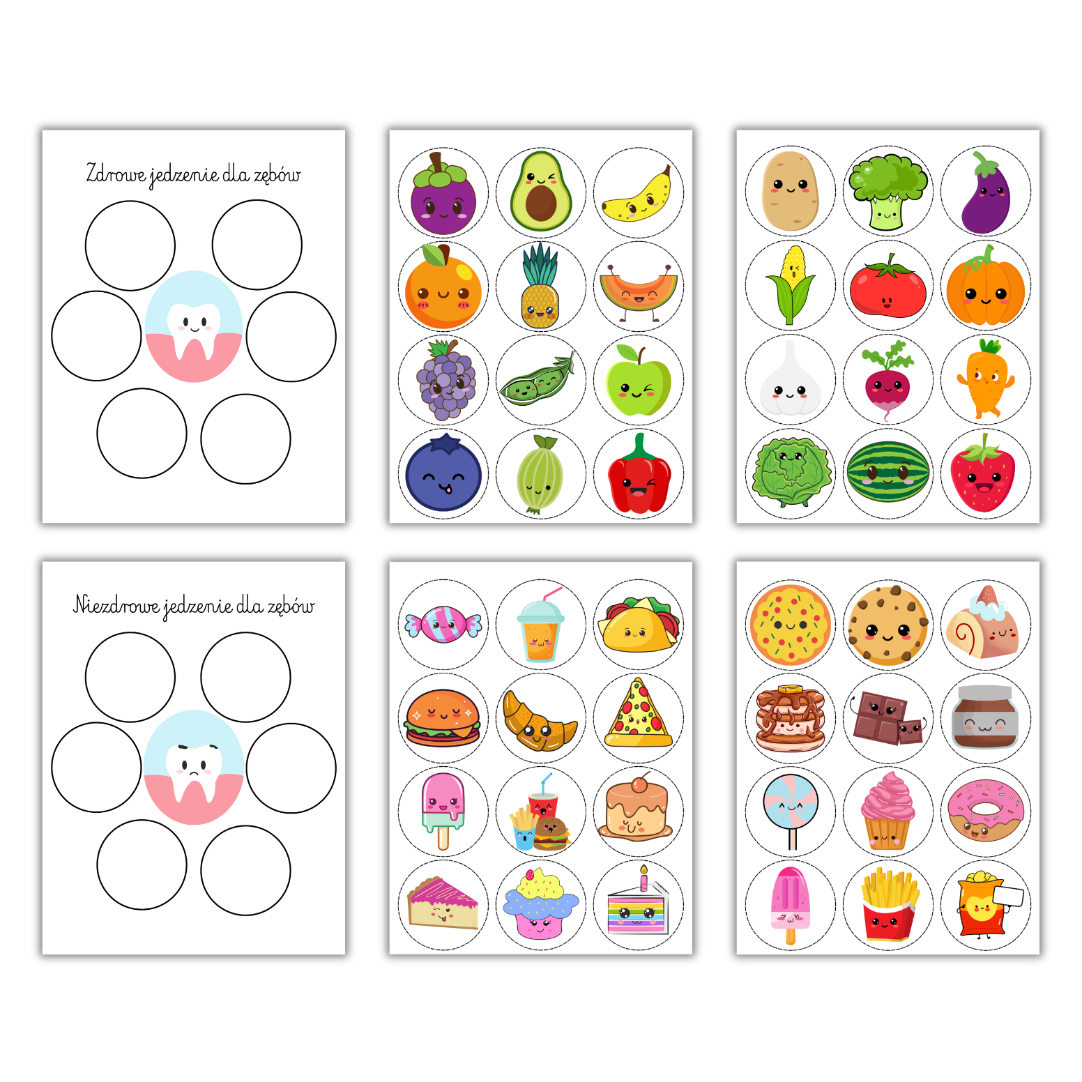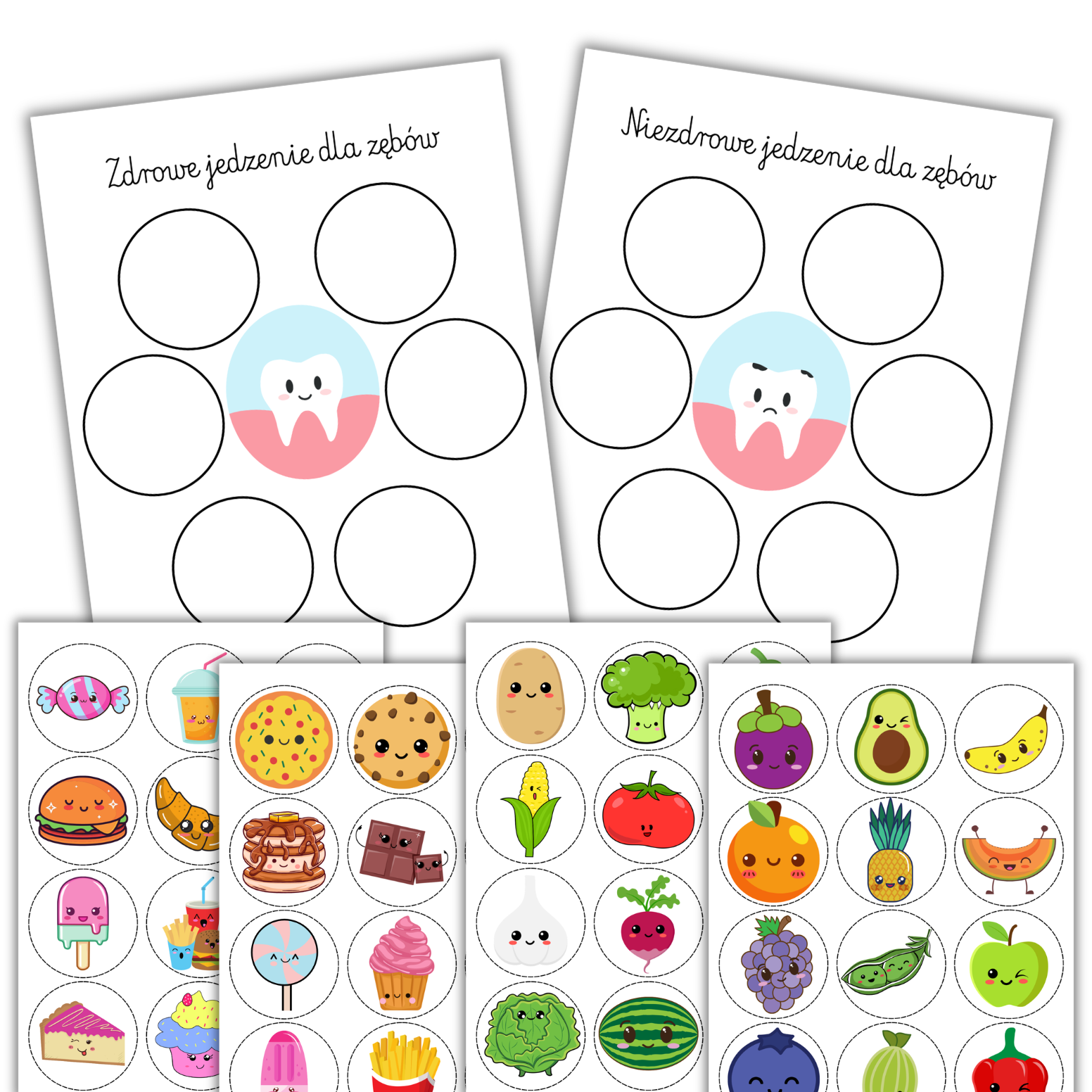 Dwie plansze bazowe: Wesoły, zdrowy ząbek (produkty zdrowe) oraz smutny, chory ząbek (produkty niezdrowe).