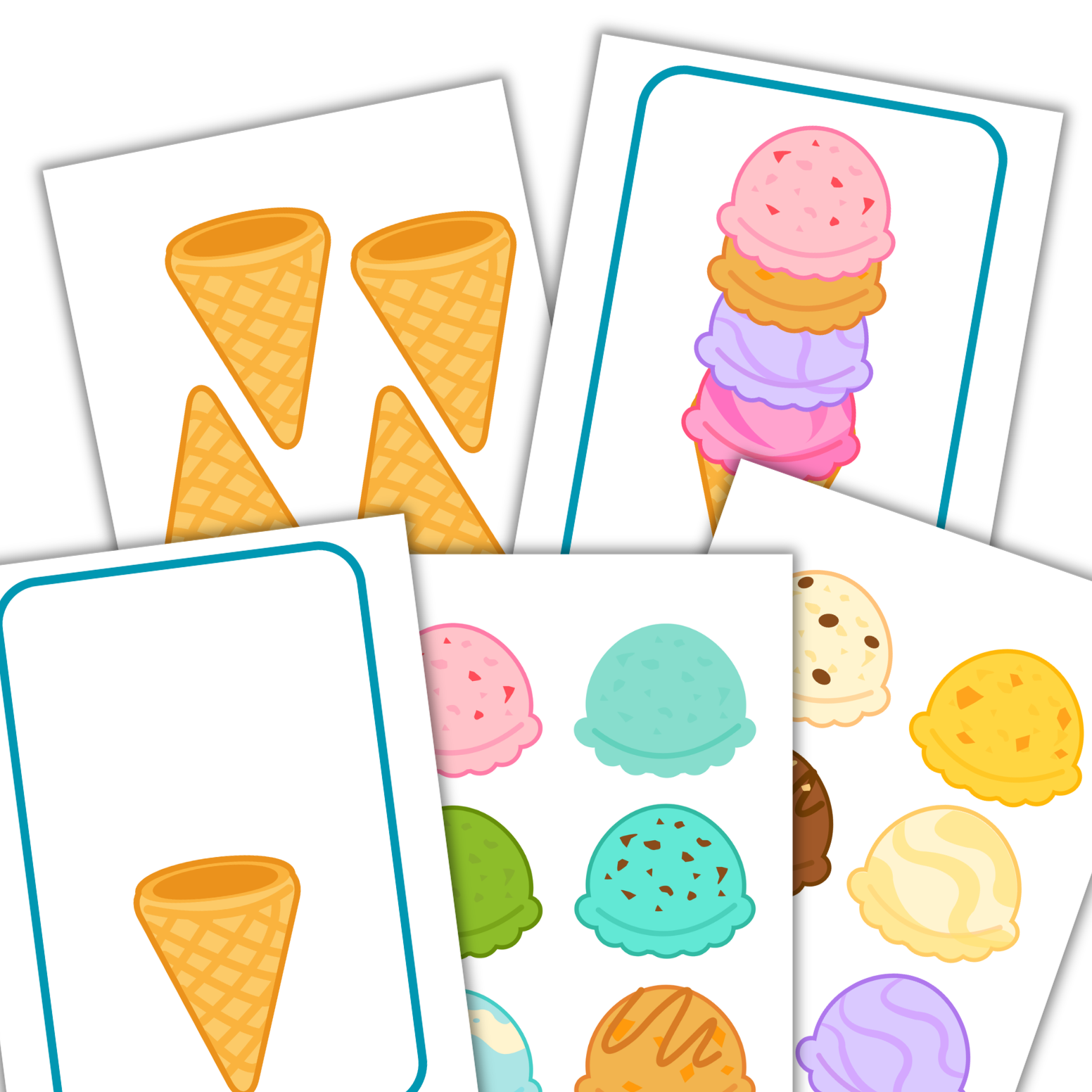 - Elementy do wycięcia: kolorowe gałki lodów oraz szablony wafelków